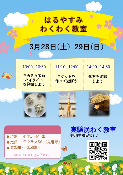 対象:幼児、小学1年生〜中学3年生4名までの少人数で学びます。月3回✕50分です。幼稚園や小学校、科学館などに出張授業にも行きます。