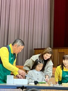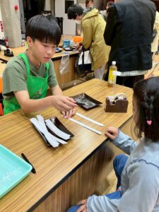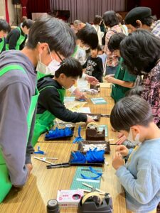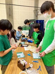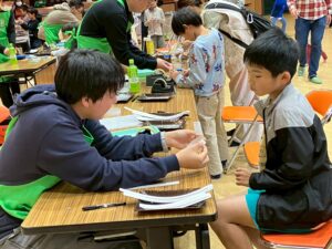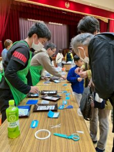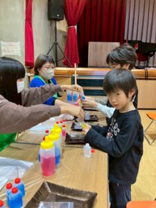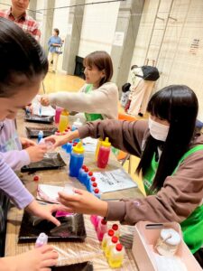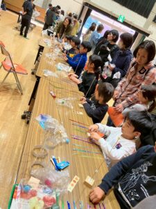 教室の卒業生やベテランの子やお母さんにスタッフとして、ご協力して頂き科学実験工作教室をしました。子どもたちにていねいに説明してくれます。