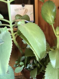 2026.01.30 お知らせ 子宝草 遅くなりましたが、本年もよろしくお願いします。 子宝草のつぼみが大きくなってきました。子宝草は葉っぱから、葉っぱが生えてくる不思議な植物です。数年かけて1株から増やしてきました。栄養生殖で仲間をふやすのが有名ですが、あたたかい場所で育てると花を咲かせてくれることがあります。年末にかけて1mほどの高さに成長し、つぼみをつけてくれました。教室の子どもたちも葉を家で育ててくれていますので、「いつ咲くのかな」と花が咲くのを楽しみにしています。