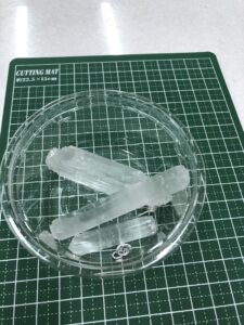 毎日寒いですが、寒くなると結晶をつくる実験がうまくいきます。どのように結晶ができるか、その瞬間を観察しました。見ている前で結晶が成長してゆく様子はおもしろいですね。