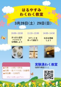 2026.02.18 お知らせ 春休みわくわく教室 年長さんクラス 3月28日、3月29日に春休みわくわく教室を開催します。 10:00~キラキラ金色に光るパイライトの発掘します 11:10~ロケットをつくってとばす科学工作をします 14:00~本物の化石を発掘します 各クラス先着5名になりますので、ご希望さらる方はお申し込みください。 4月から年長さんのクラスを新設します。 月曜日16:25~17:15 日曜日10:00~10:50 詳しくは後日ご案内します。